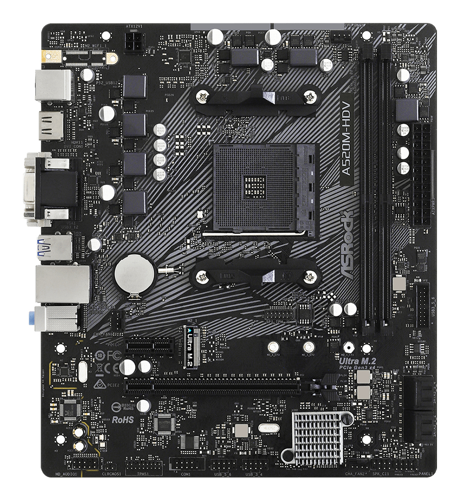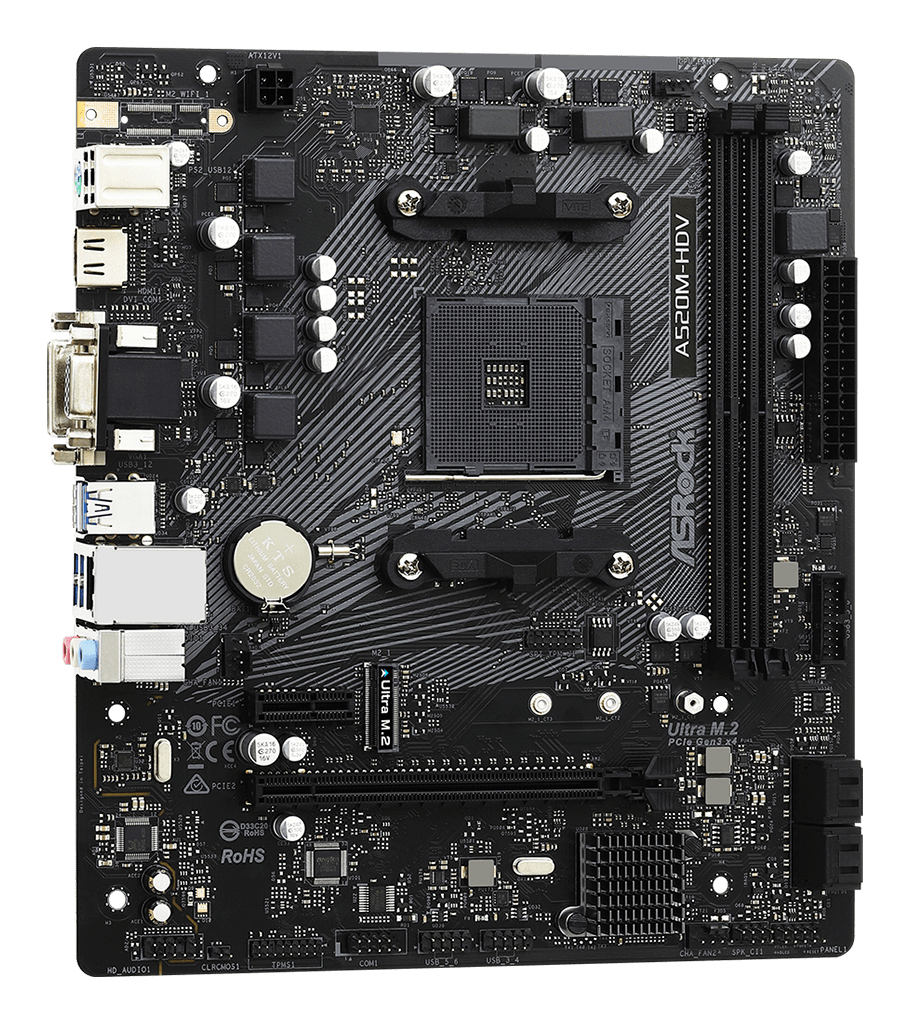 Η μητρική κάρτα Asrock A520M-HDV απευθύνεται σε χρήστες που θέλουν να κατασκευάσουν ένα οικονομικό σταθερό υπολογιστή βασισμένο σε επεξεργαστή AMD. Είναι συμβατή με τους επεξεργαστές AMD Ryzen (AM4) της τελευταίας γενιάς και υποστηρίζει μνήμες DDR4 με συχνότητες έως και 4733 MHz (OC). Διαθέτει υποδοχές PCIe 3.0 για τη σύνδεση καρτών γραφικών και επιπλέον υποδοχές PCIe 3.0 και SATA III για τη σύνδεση επιπλέον συσκευών επέκτασης. Επιπλέον, διαθέτει ενσωματωμένη κάρτα ήχου και δικτύου, ενώ είναι επίσης εξοπλισμένη με USB 3.2 Gen1 υποδοχές για σύνδεση ταχείας μεταφοράς δεδομένων.