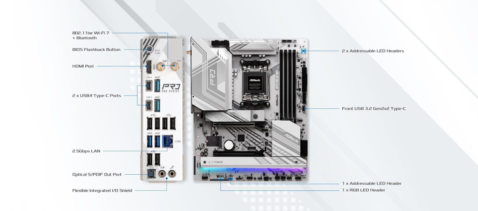 Η μητρική υποστηρίζει DDR5 RAM, προσφέροντας αυξημένη ταχύτητα και απόδοση, ενώ διαθέτει PCIe 5.0 slots για γραφικές κάρτες και αποθηκευτικά μέσα επόμενης γενιάς. Περιλαμβάνει πολλαπλά M.2 slots με ενσωματωμένες ψύκτρες για ταχύτατη και αξιόπιστη αποθήκευση. Η συνδεσιμότητα ενισχύεται με Wi-Fi 6E και 2.5Gbps LAN, εξασφαλίζοντας γρήγορη και σταθερή σύνδεση στο δίκτυο.